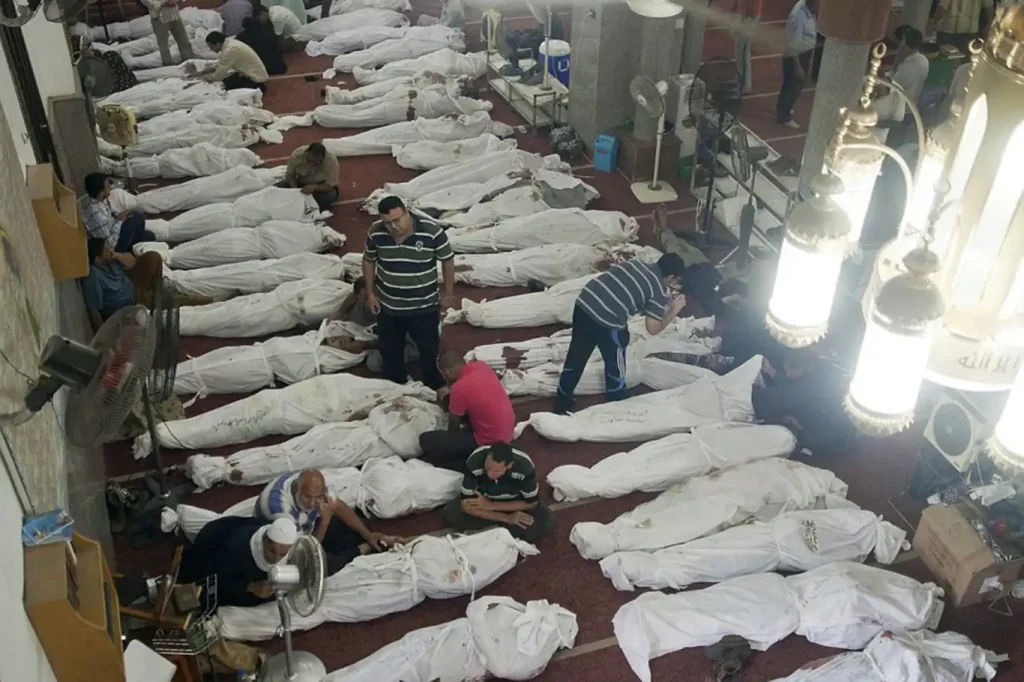 Mısır ordusu 11 Ağustos’ta yapılan protestoların devam etmesiyle halka nota vererek tüm meydanların boşaltılmasını istedi. Halk darbeye karşı koymaya devam etti. Mısır Ordusu, 14 Ağustos günü halka tekrar saldırmaya başladı. Protestocuların çadırları, yaşadıkları alanlar, kullandıkları seyyar hastaneler ateşe verildi. Olağanüstü hal ilan eden askerler, katlettikleri insanların cesetlerini yok etmek için önce ezdiler sonra da yaktılar. Askerler muhaliflerin sığınmak için kullandıkları Rabia Camisi’ni yaktılar. Ardından içlerinde çocuk ve kadınların da bulunduğu 700 protestocu Kahire’deki Fetih Camii’nde bir gün boyunca esir kaldı. Rabia Meydanı direnişinde sayıları tam bilinmese de binlerce insan hayatını kaybetti.