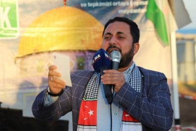 Anadolu Gençlik Derneği Mersin İl Başkanı Yasin Güngör de programda yaptığı konuşmada, Kudüs’ün özgürlüğü için yapılan duaların bir gün Mescid-i Aksa’nın avlusunda şükür namazıyla taçlanacağına inandığını söyleyerek, “Allah-u Teâla, bu bayrağın altında, şu minarelerin gölgesinde, Mersin sahilinde bir araya geldiğimiz gibi; bir gün özgür Kudüs’te, o mücahit kardeşlerimizle Mescid-i Aksa’nın avlusunda da bizleri cem eylesin. Kendinizi o fetih gününe hazırlayın. Çünkü fetih yakındır, zafer yakındır, zafer inananlarındır.” ifadelerini kullandı.