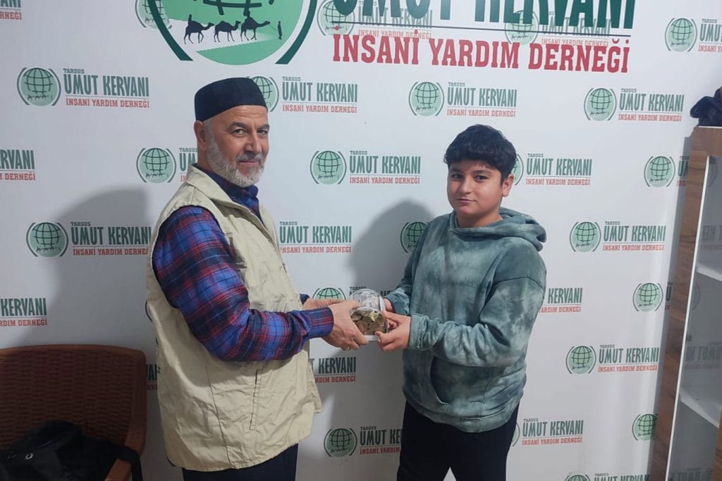 Mersin’in Tarsus ilçesinde, küçük bir çocuk kumbarasında biriktirdiği harçlıklarını Gazze’ye ulaştırılmak üzere Umut Kervanı’na teslim etti.