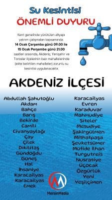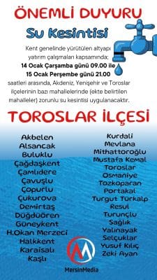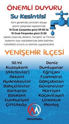 Açıklamada, su kesintisinin Akdeniz, Yenişehir ve Toroslar ilçelerinde yer alan bazı mahalleleri kapsadığı bildirildi. Yetkililer, çalışmaların kent altyapısının güçlendirilmesi amacıyla gerçekleştirildiğini belirterek vatandaşlardan anlayış istedi.