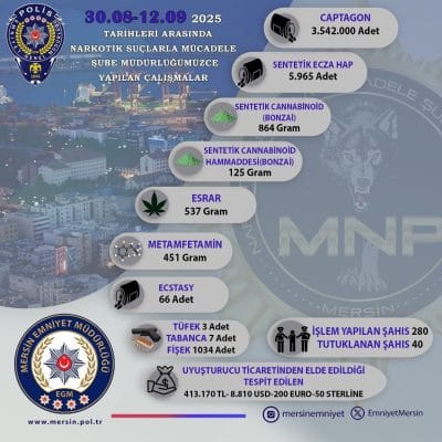 Mersin İl Emniyet Müdürlüğü Narkotik Suçlarla Mücadele Şubesi, 30 Ağustos – 12 Eylül 2025 tarihleri arasında gerçekleştirdiği operasyonlarla uyuşturucu tacirlerine göz açtırmadı.