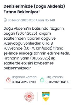 Yetkililer, özellikle denizciler ve bölgede bulunan vatandaşları dikkatli ve tedbirli olmaları konusunda uyardı. Fırtınanın, 1 Mayıs 2025 Perşembe günü sabah saatlerinde etkisini kaybetmesi bekleniyor.