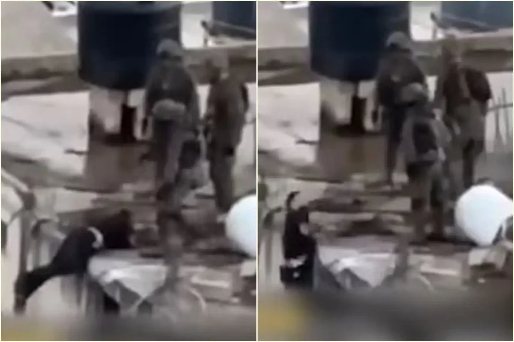 3 işgal askerinin, katlettikleri Filistinlilerin cenazelerinin bulunduğu binanın çatısında olduğu görülüyor.